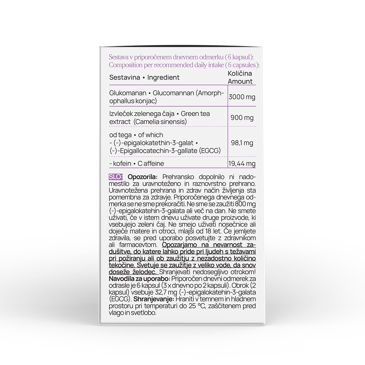 - Ne uživajte izdelka, če v istem dnevu uživate druge proizvode, ki vsebujejo zeleni čaj.