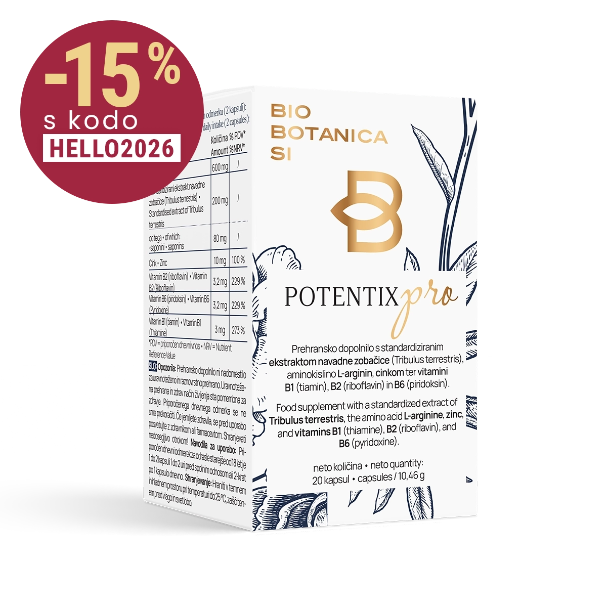 - Vsebuje izvleček navadne zobačice (Tribulus terrestris).