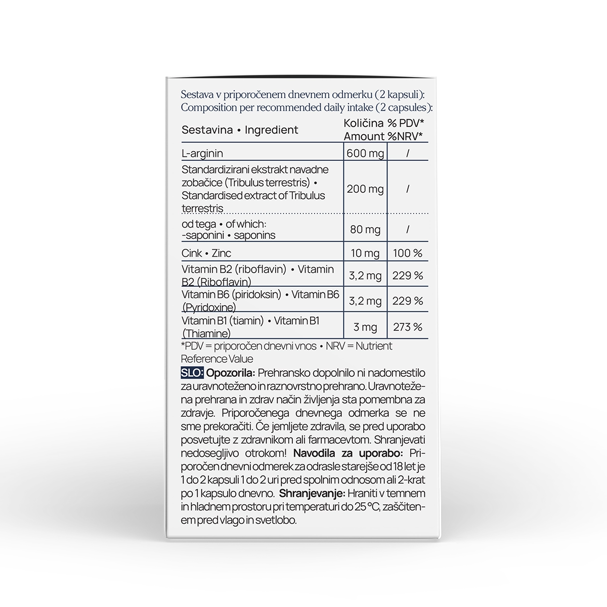 Sestavine: L-arginin, standardizirani ekstrakt navadne zobačice (Tribulus terrestris), cinkov bisglicinat, riboflavin 5’-fosfat, piridoksin hidroklorid, tiamin hidroklorid, sredstvi proti sprijemanju: silicijev dioksid, magnezijeve soli maščobnih kislin.